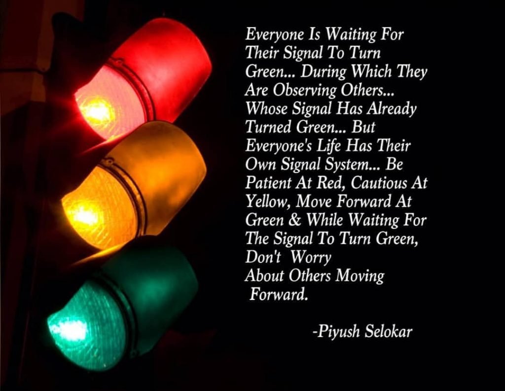 Everyone Is Waiting For Their Signal To Turn Green… During Which They Are Observing Others.. Whose Signal Has Already Turned Green… But Everyone’s Life Has Their Own Signal System.. Be Patient At Red, Cautious At Yellow, Move Forward At Green & While Waiting For The Signal To Turn Green, Don’t Worry About Others Moving Forward.