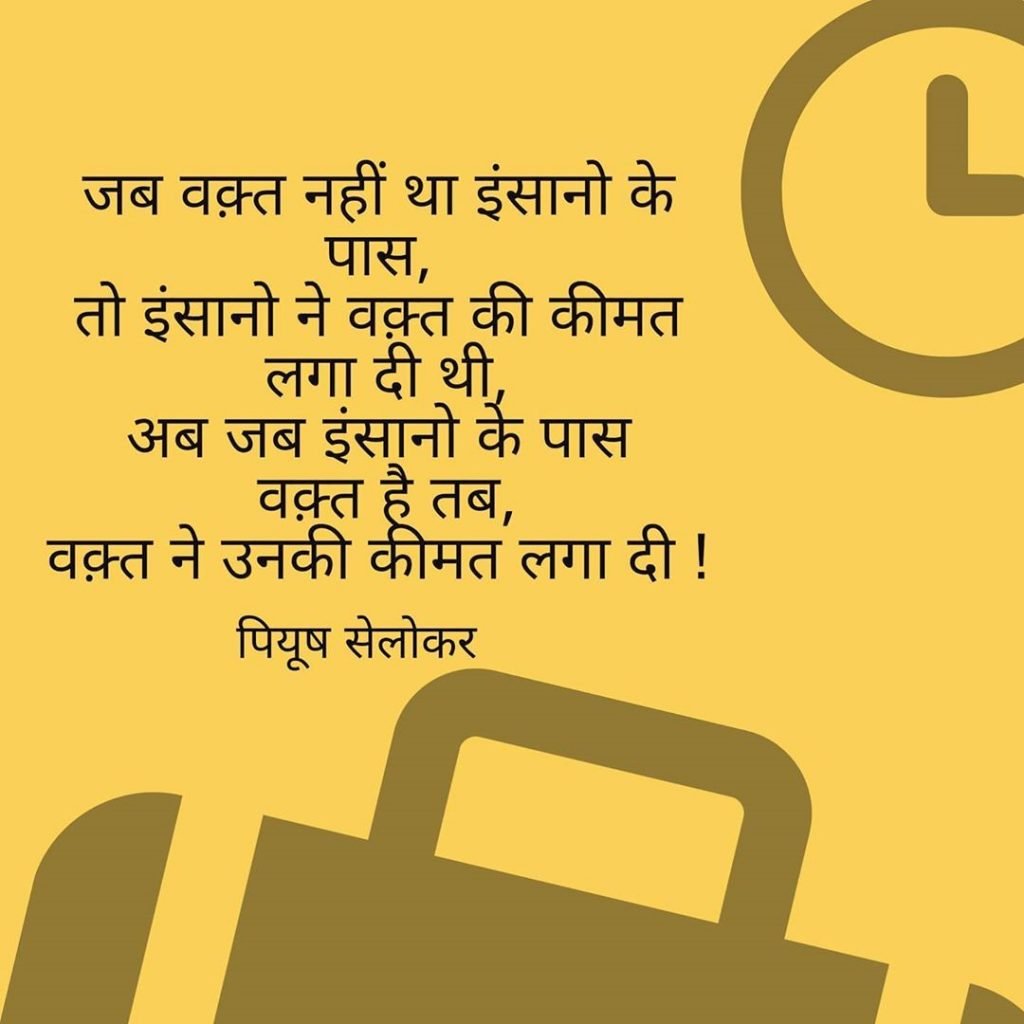 जब वक़्त नहीं था इंसानो के पास, तो इंसान ने वक़्त की कीमत लगा दी थी अब जब इंसान के पास वक़्त है तब, वक़्त ने उनकी कीमत लगा दी ! Leave a Comment / Micro Blogs, Motivational, Quotes / Piyush Selokar जब वक़्त नहीं था इंसानो के पास, तो इंसान ने वक़्त की कीमत लगा दी थी अब जब इंसान के पास वक़्त है तब, वक़्त ने उनकी कीमत लगा दी ! Read More »