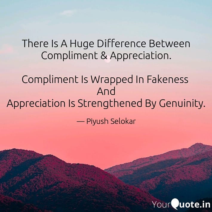 There Is A Huge Difference Between Compliment & Appreciation. Compliment Is Wrapped In Fakeness And Appreciation Is Strengthened By Genuinity. Leave a Comment / Motivational, Quotes / Piyush Selokar There Is A Huge Difference Between Compliment & Appreciation. Compliment Is Wrapped In Fakeness And Appreciation Is Strengthened By Genuinity. Read More »